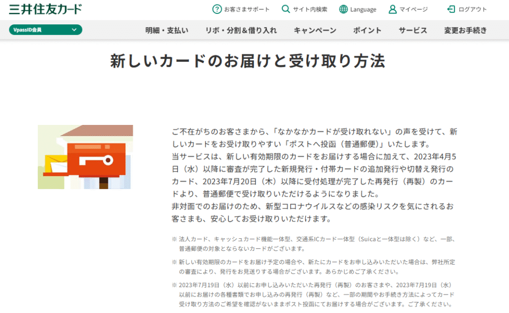 Vpassメニューの変更お手続きにカード受取方法変更がありました。